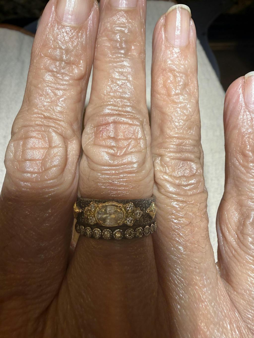 Just wore it today with another Armenta on the other hand. Solid and feminine by itself - I haven't tried stacking it yet. I like that textured backside with the jewels at the front.