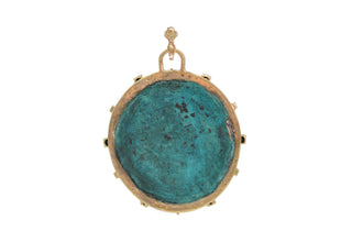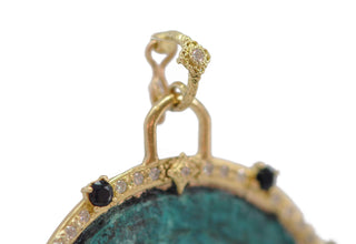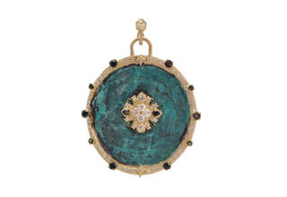Sueno 18kt gold artifact 55 mm round enhancer with crivelli, black sapphires, green tourmalines, white sapphires and white diamonds with teal patina