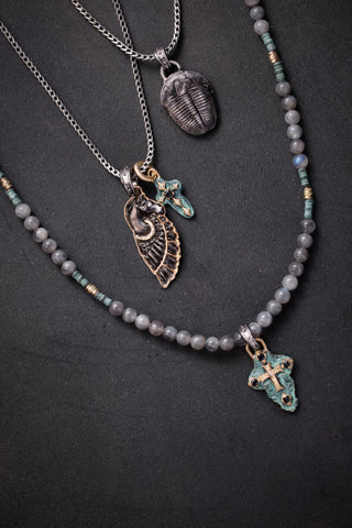 18k Yellow Gold and Grey Sterling Silver Necklace with Labradorite and Artifact Pebbles in Teal Patina. Adjustable At 26".