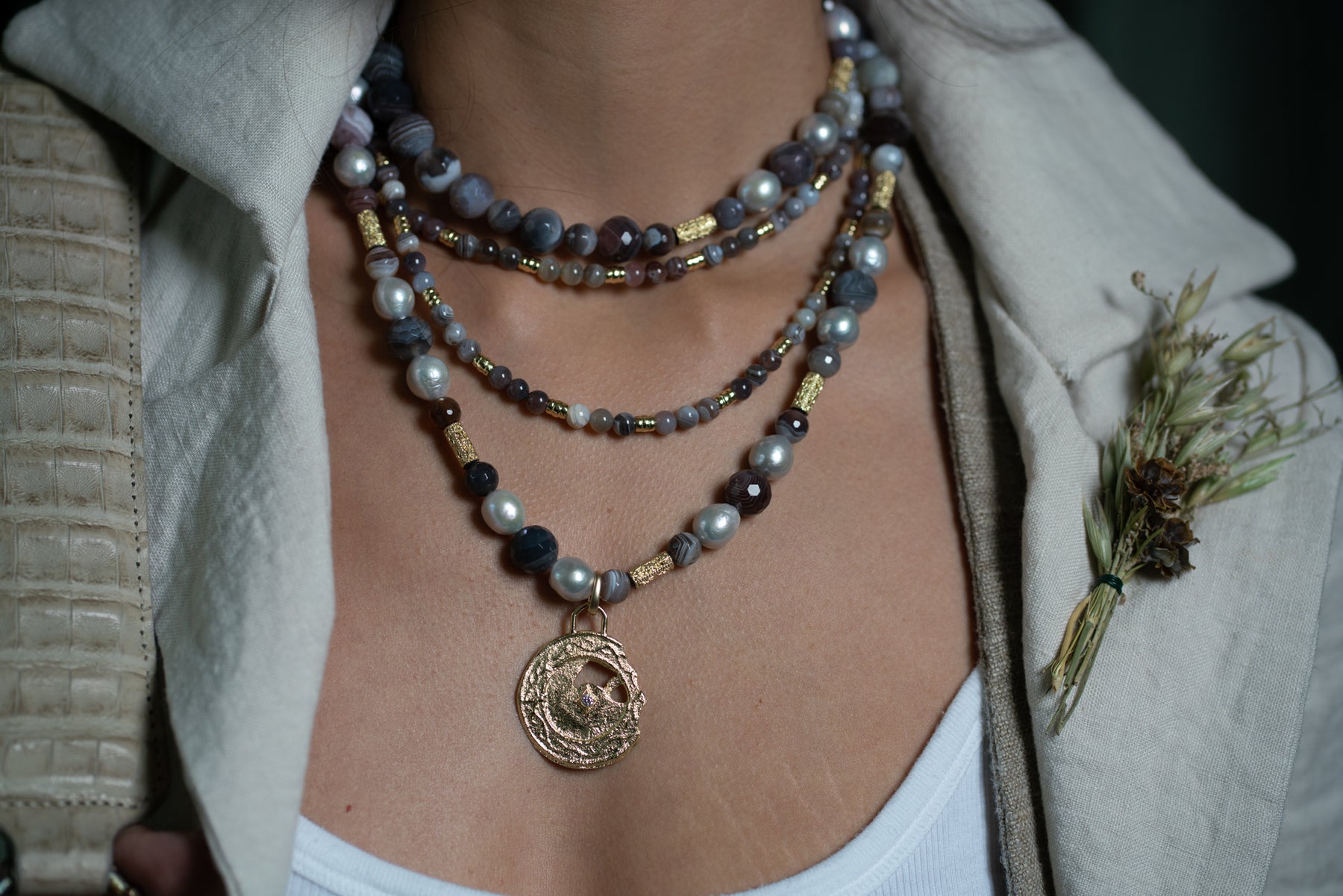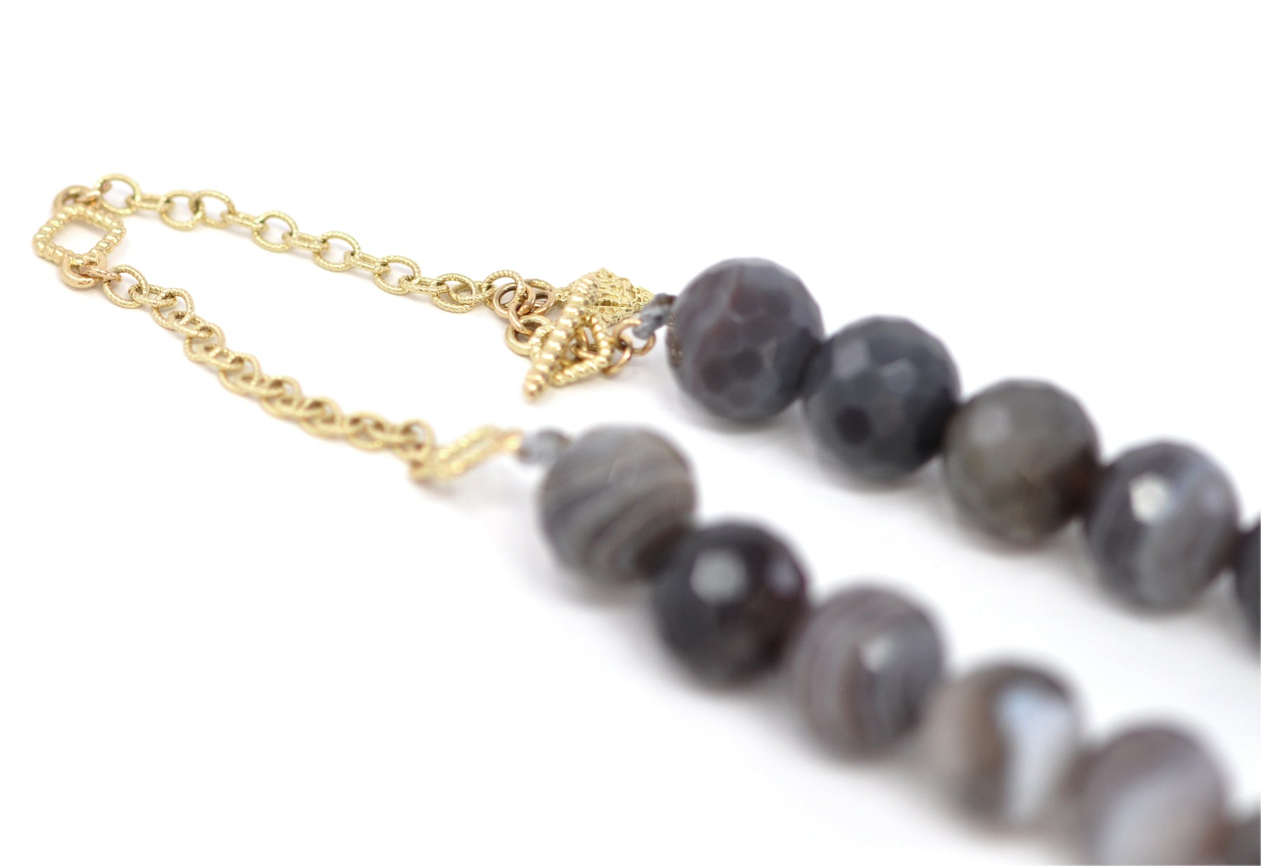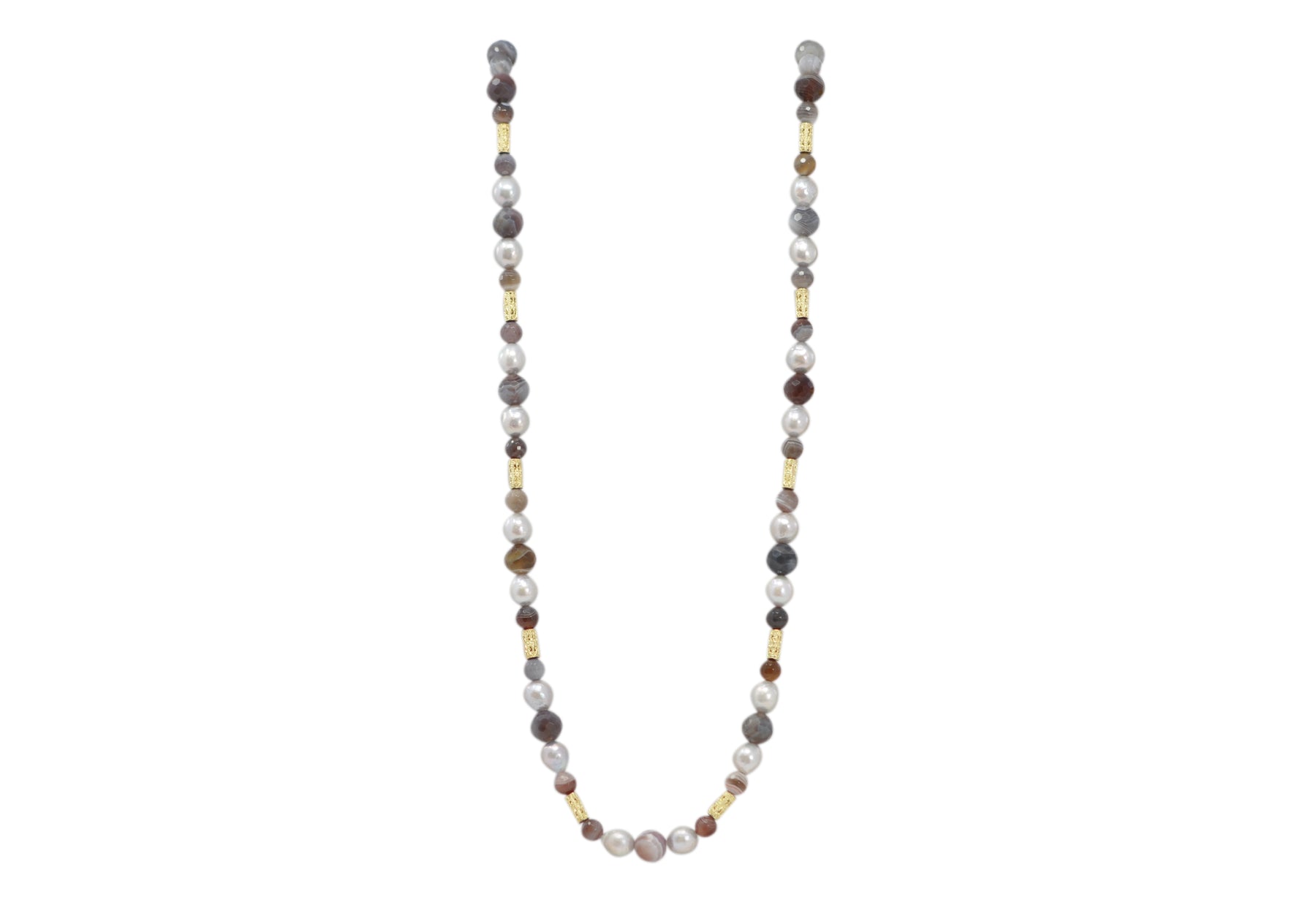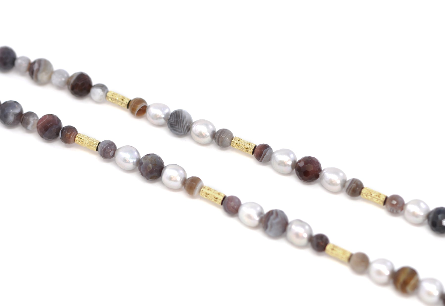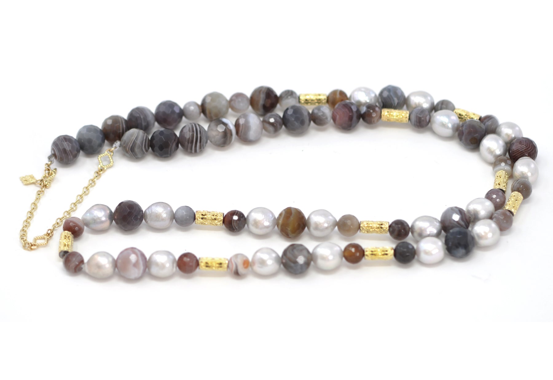 18k Yellow Gold necklace with 8mm and 12mm Botswana Agate Faceted beads and 10mm Silver Edison Pearls with carved texture stations. Adjustable at 32", 34", and 36" with toggle closure.