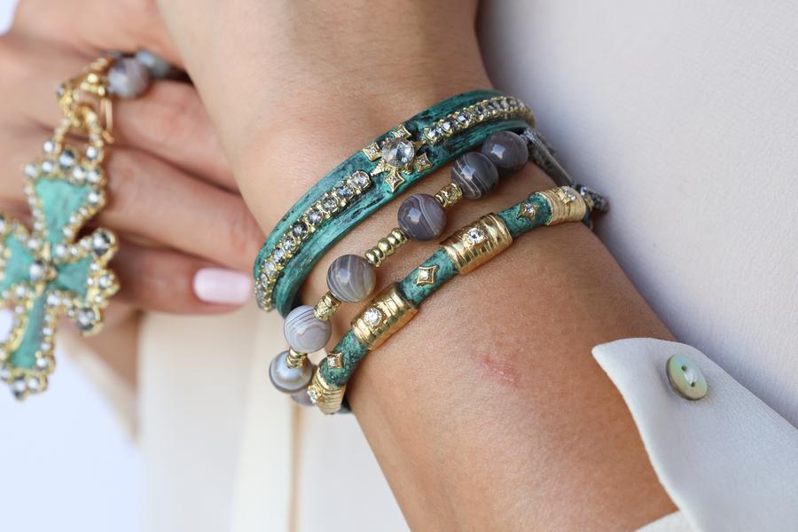 Bracelet 18k Yellow Gold Artifact teal patina crivelli with 3.103CT Grey Diamonds.