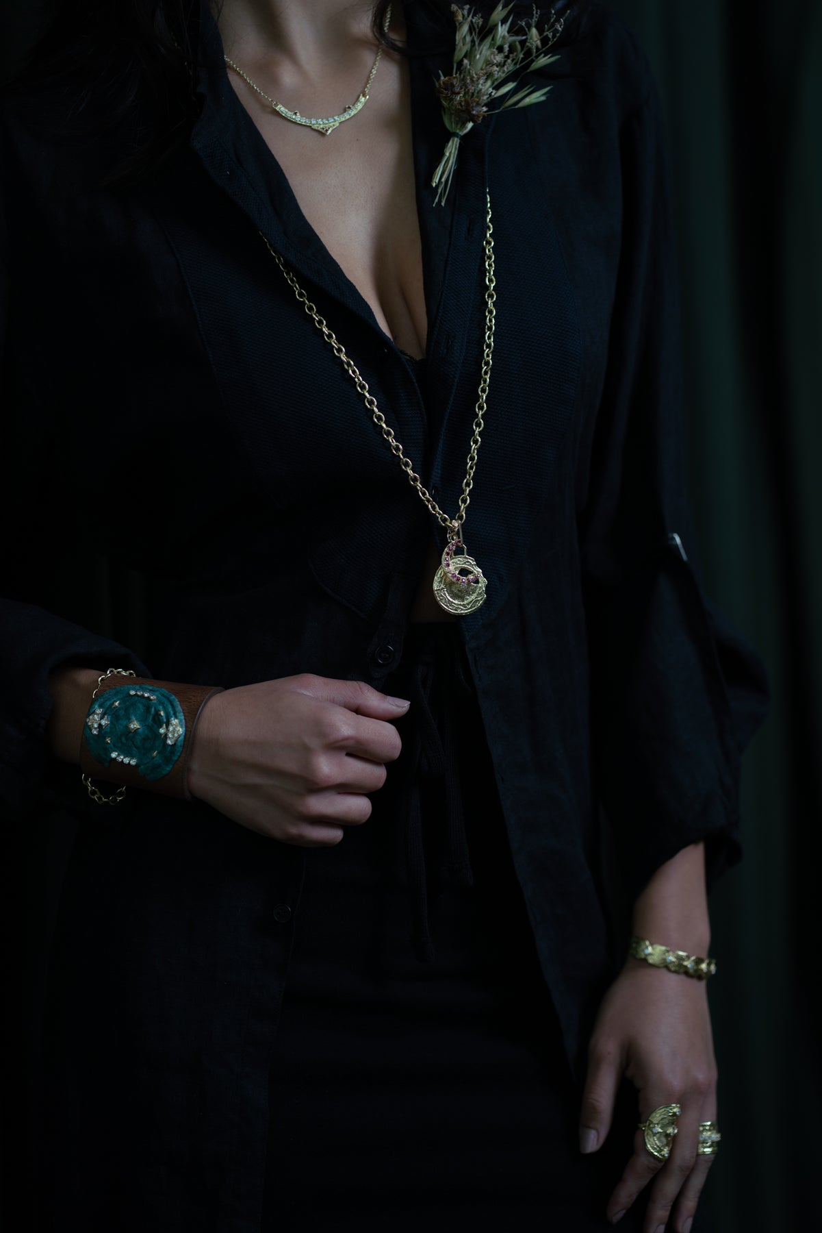 18k Yellow Gold and Blackened Sterling Silver Artifact wide leather cuff featuring medallion and Artifact chain closure in Teal Patina with crivelli and white diamonds.