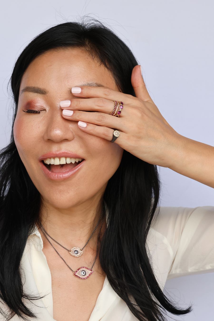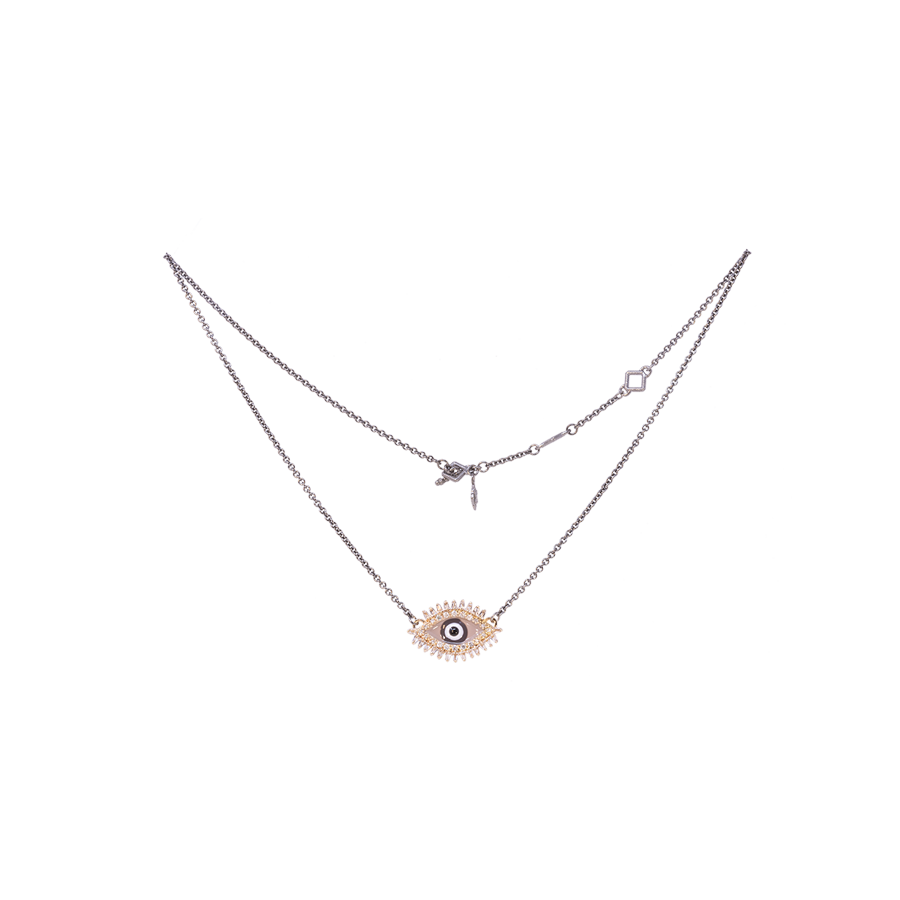 Necklace 14kt Rose Gold and Grey Sterling Silver eye enamel with 0.184 CT White diamonds and Morganite. Adjustable 16",17" and 18".