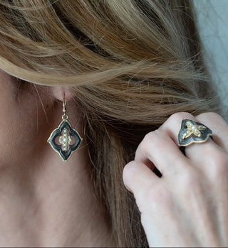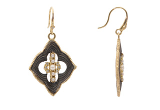 18k Yellow Gold and Blackened rhodium finish Sterling Silver open scroll drop earrings with carved border featuring pearl and 0.07TCW white diamond cross stations on crivelli hooks. Measures 29mmx22mm (39mm with hook).