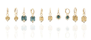 18k Yellow Gold earrings featuring detachable 23mm carved artifact and Crivelli drops on 13 mm huggie with 0.61TCW white diamonds. Measures 23x12 (33 with huggie).