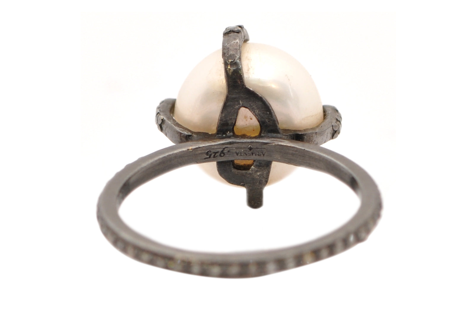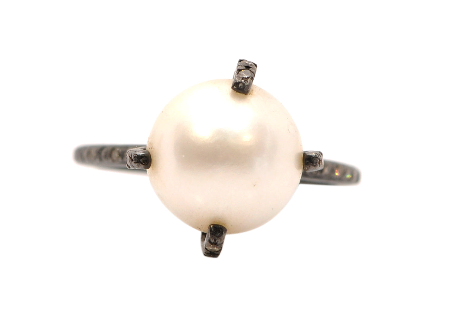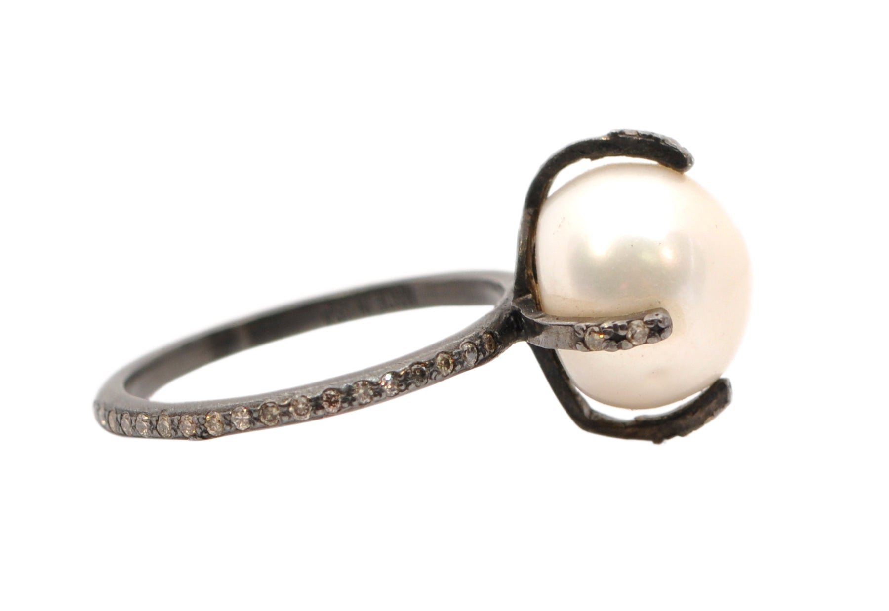 Blackened rhodium finish Sterling Silver pave diamond prong ring set with white button pearl on 0.25TCW round champagne diamond eternity band. Band measures 1.68mm.