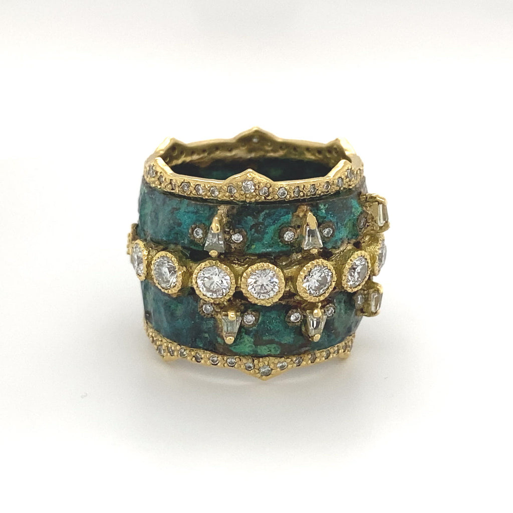 18K Yellow Gold Pointed Artifact Crivelli Ring in Teal Patina with 3MM White Diamonds and White Sapphire Baguettes. (1.46 TCW)