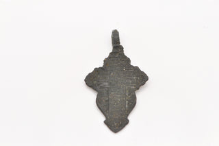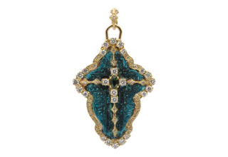 Sueno 18kt yellow gold artifact cross enhancer with white diamonds, crivellis and blue-green tourmaline in Iris Blue Patina.
