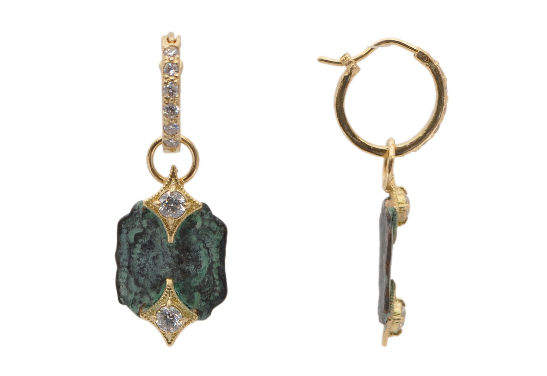 18k Yellow Gold 13mm huggie artifact drop earrings in patina with crivellis and 0.64TCW white diamonds. Measures 19.5mmx12mm (23mm with huggie).