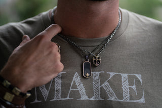 18k Yellow Gold and Blackened Sterling Silver 22" chain necklace large black pave dog tag enhancer with textured border, scroll with crivelli, black sapphires and champagne diamond.