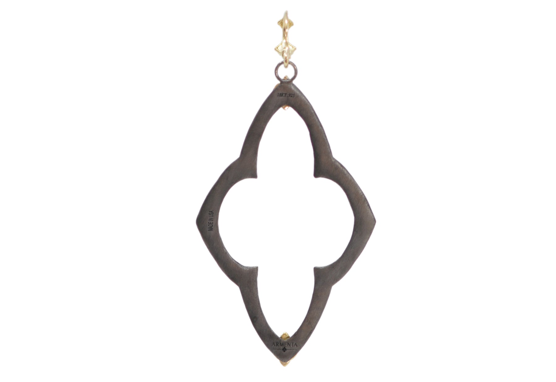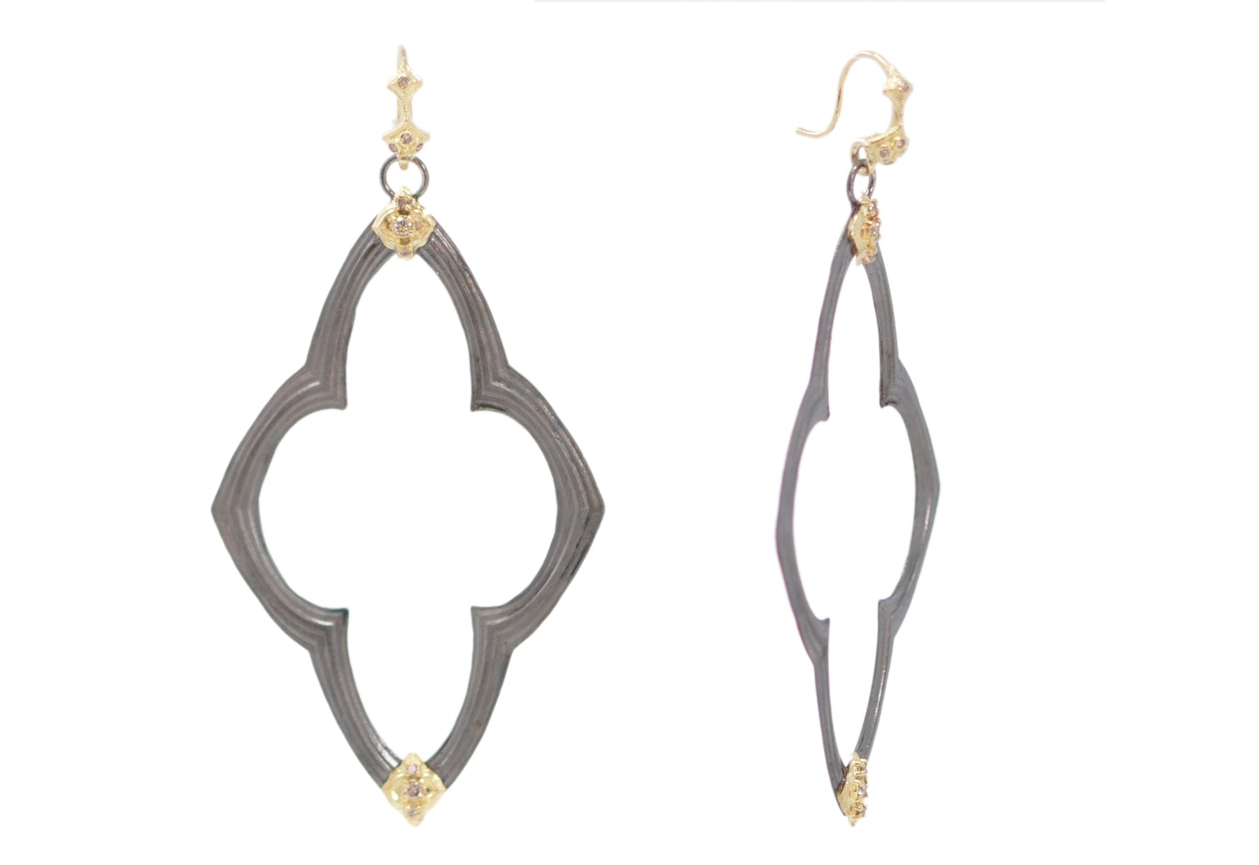 18k Yellow Gold and Grey Sterling Silver open scroll earring with champagne diamonds on crivelli hook.