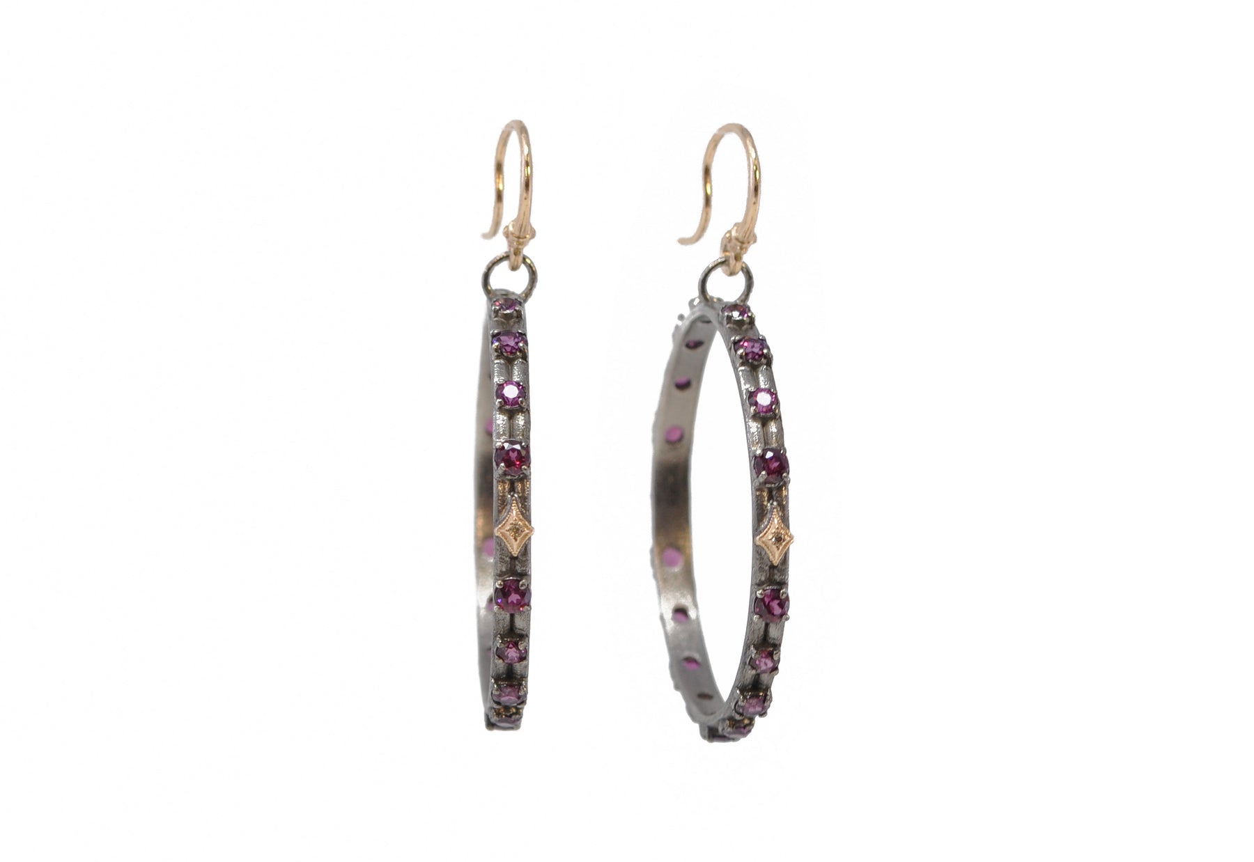 14k Rose Gold and Grey Sterling Silver Crivelli Open Circle Drop Earrings with 0.02 CT Champagne Diamonds and Purple Garnets.