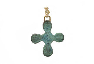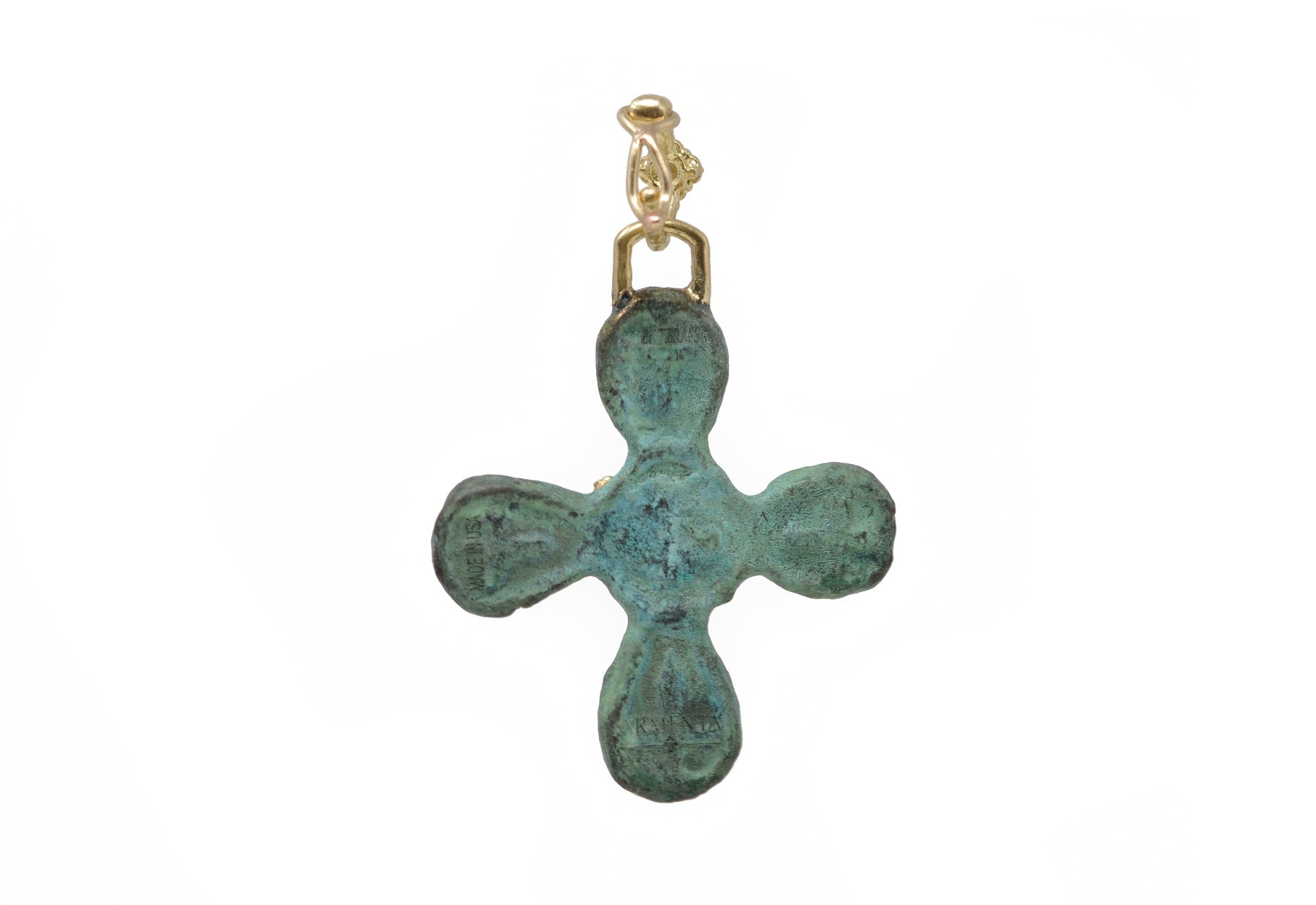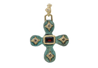 18k yellow gold large artifact cross enhancer in green patina with crivellis, garnet and champagne diamonds