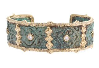 18K Yellow Gold Artifact Wide Band Cuff with White Diamonds. (0.98 TCW)