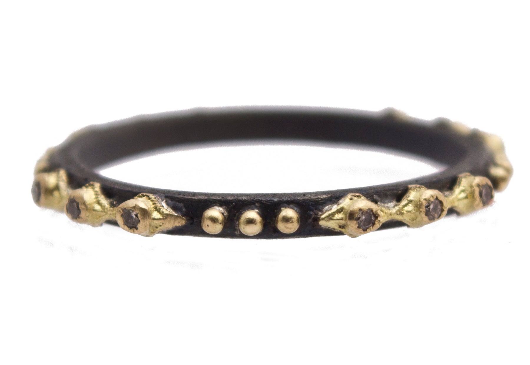 18K Yellow Gold and Blackened Sterling Silver Multi-Crivelli Stack Band Ring with Champagne Diamonds. (0.07 TCW)